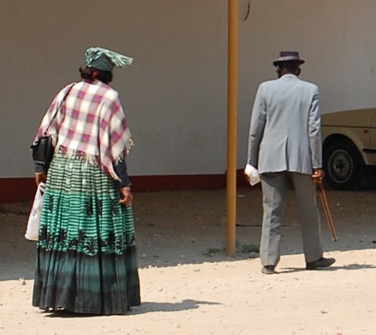 The traditional dress of one of the Namibian tribes is a pseudo Victorian with a hat that looks like cow horns.